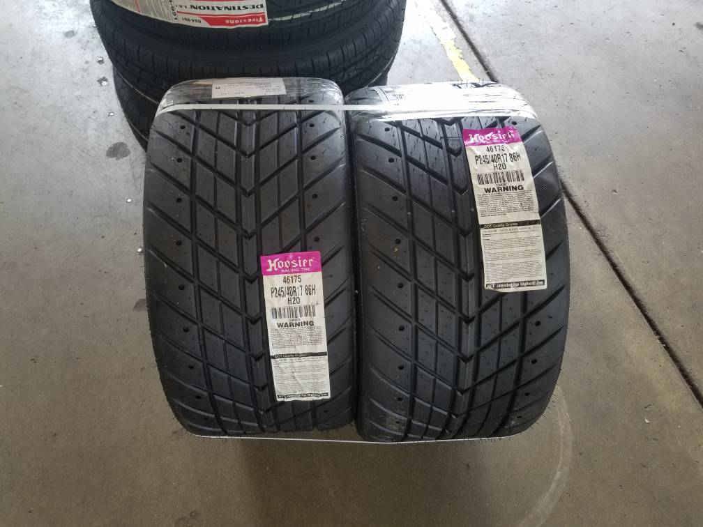(Thread Starter) | Not Ranked : 0 score Good weekend. Saturday was pouring rain most of the morning, so we bailed. Sunday turned out to be a pretty nice day. I ended up with a trifecta - 1st in class, 1st on overall raw time, and 1st on index. My 1st time ever for that. I was pretty happy with the car - I put in Hawk HP+ brake pads up front and they are on the opposite end of the spectrum. Maybe too touchy, but I want to run them another day or two before I decide on something else. Great braking power at low pedal pressure, so it doesn't seem to be a vacuum or brake booster issue. I got a little more used to them a couple runs in, but still locked up the front tires very briefly once or twice. Johanna had a rough day mashing cones. She ended up 9th on overall raw time with the cone, and would have been 6th if it was clean. For future rainy days, I picked up some Hoosier H2O rain tires. These will go on my green XXR's. 245/40/17, but they look gigantic. ![]()