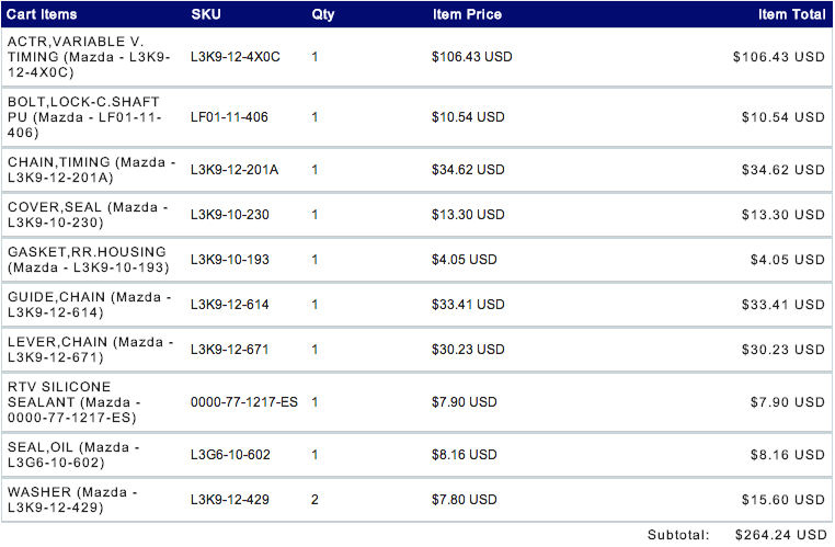 I just bought parts off partsvp.com for a fraction of the normal cost. They are being sent from Rosenthal Arlington Mazda Parts Store, I looked all over to get a good idea of what parts are really necessary and which aren't. Obviously depends on the car... here is the list I came up with and the prices. ![]() EDIT: I bought the timing chain guides, for some they don't need them but I am at 80k and figured it was worth it. And if you end up not needing some of the parts you can return them for a full refund.