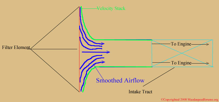 (Thread Starter) | Design 1: Velocity Stack At first glance, it appears to be a simple intake piece. We are all familiar with the assortment of intakes out for the Mazdaspeed 3 today. Some of the intakes on the market today are considered half baked concepts. The inside diameter of these MAF housing vary among intakes. Some, have been known to cause lean conditions within the ECU and created an assortment of driveability issues or MIL codes, which illuminate on your instrument panel. Some of them are just plain junk and are avoided among the community. So what makes Cobb's so much different than everyone else? Well, if we look back at the 60's, a lot of top hot rodders used velocity stacks in their carburetors to smooth the incoming air. A velocity stack is a usually cylindrical tube of some type with a radiused inlet end device. When this device is added onto the air entry location or locations of an engines intake system, it will:
