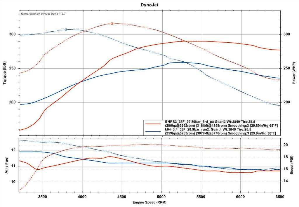 | Not Ranked : 0 score Here you guys go, my current BNR tune on new engine vs. Stratified tuned k04 on old engine on crappy 91 pump gas, SAE corrected. The BNR setup on 91 is still getting some kr (1-1.5) north of 5k so ignition/advance and boost needs to come down a bit north of 5500. I thought it was pretty cool how the curves aligned from two different motors, 1.5 years apart with 2 different turbos. I love this graph. Pump gas for pump gas, the BNR still outflows the k04 and holds power to redline. You can see how the torque peak hit is about 500RPM later and the BNR setup holds the power curve a lot flatter north of 5k. This graph perfectly illustrates what the BNR does for a k04 car.