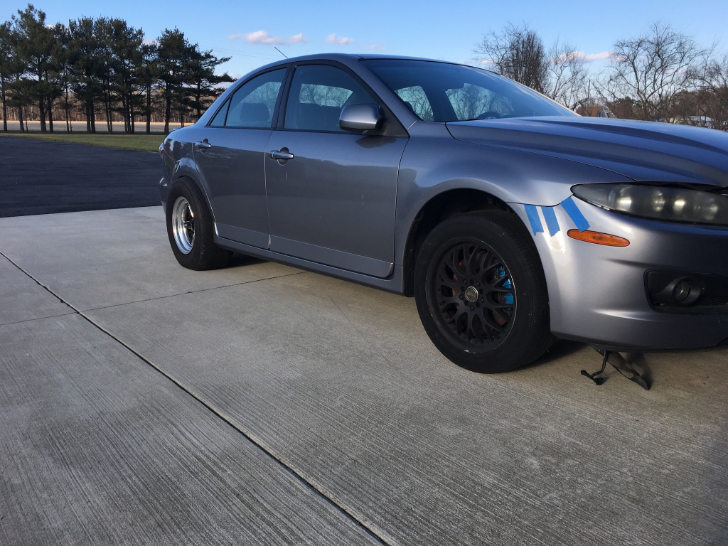 03-05 Mazda6 rears. They should be considerably smaller. A set of good rotors and pads and I should be fine. I really do want them to tuck. And I'm sure the 6.5"BS (51mm offset) will be nice and flush. I also decided to run 245/55/15 M&H radials. Equivalent to a 26x9. I've had good luck with M&H on my Chevelle (325/45/17) and my Nova (390/45/15). This makes it easier for me on the front tires as well. I can do a 17 in the front with Evo calipers and 245/45/17