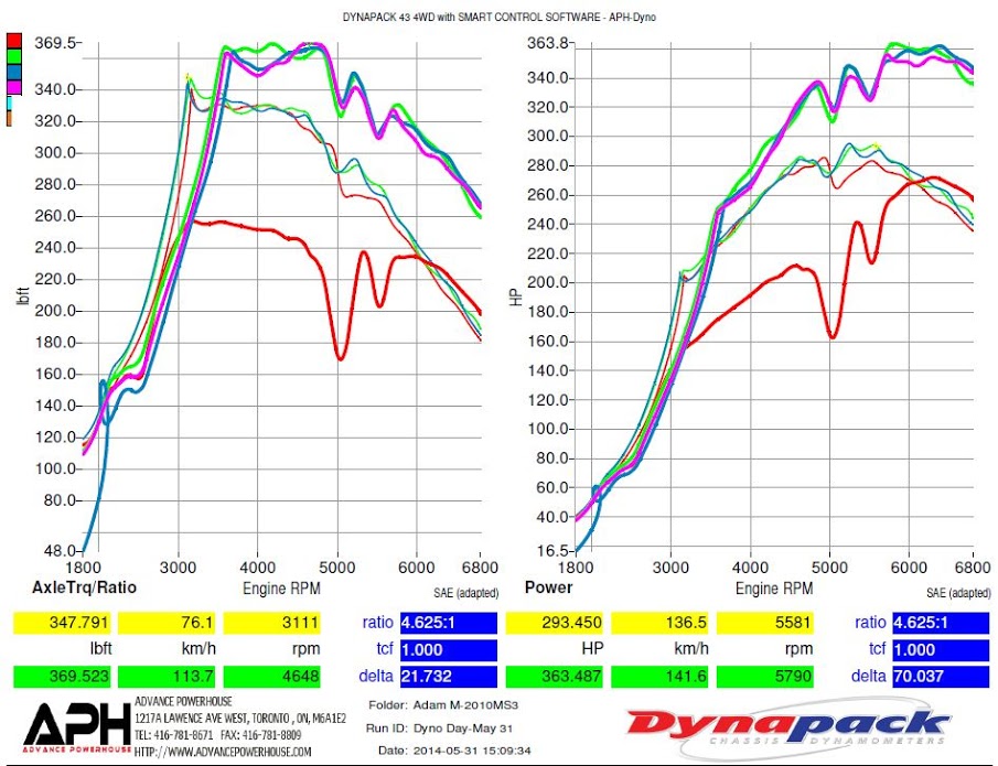 | Not Ranked : 0 score Here is a cut and paste of my thread on torontomazda3. This was posted by Vincent at Mspeed tuning and diagnostics, who was responsible for tuning my car. 2010 MS3 55K KM Cobb AP v3 MSpeed custom tune Garrett GTX2867 Autotech HPFP internals HTP 3" intake HKS SSQV BPV in recirculating mode CS TMIC TurboXS DP w/ Magnaflow single cat Ultimate Racing Test Pipe + CBE CP-e SafeSeals Grimmspeed 3-port EBCS Bosch 3-bar MAP sensor CS OCC CS Full engines mounts Ultra94 363whp/400wtrq CORRECTED* [363whp/370wtrq on dyno] Gain of +70whp/+23wtrq @ peak or +23.9%whp/+6.6%wtrq** Regarding gearing, dyno and corrections. MBNTO has reviewed the dyno plots done @ APH and he has discovered inconsistencies in the gearing ratio used for Gen2's on the dyno. I have corrected Adam's numbers with calculations below. As well, Brian's dyno, esp the front left module is still on the fritz and it's responsible for the dip @ 5000rpm and 5500rpm. *Trq correction for gearing: (Dyno Trq * Dyno Ratio) / (4th Gear Ratio * Final Drive) = (370*4.625)/(1.02*4.19) = 400 **Correction for previous peak trq of 348: = (348*4.625)/(1.02*4.19) = 377 Then, 400 - 377 = 23