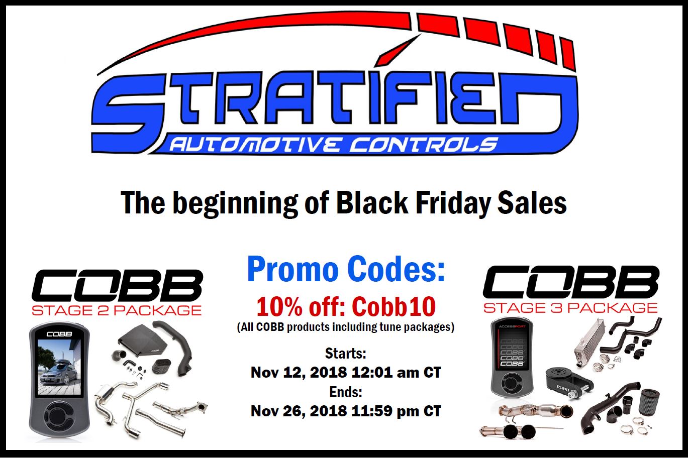 (Thread Starter) | Not Ranked : 0 score We are going to kick things off with a sale that includes all things COBB. Yes that means the discount applies to Accessports that include our tunes and parts that include tune credits. Everything COBB on our site is 10% off with the use of coupon COBB10. Thank you everyone for your support this year - this is our thank you to you! www.stratifiedauto.com