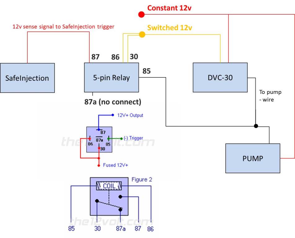 | Not Ranked : 0 score Hey @Lex; I could use your help here. So, in the Devil's Own System, the pump gets a constant 12V and the DVC-30 closes the ground to the pump to energize the pump. The Snow SafeInjection system input trigger requires a +12V input. I used a relay that should use the DVC-30 ground switch to close the relay coil and provide the 12v signal to the SafeInjection. Problem is, the relay latches as soon as I connect power to the car even though the power should be isolated. It seems like the relay is somehow getting energized by the 12V constant through the pump wire? Any ideas? this is a diagram. I can't figure it out.