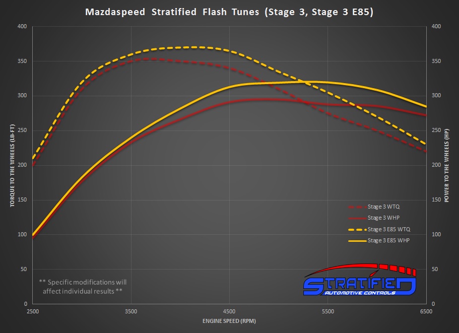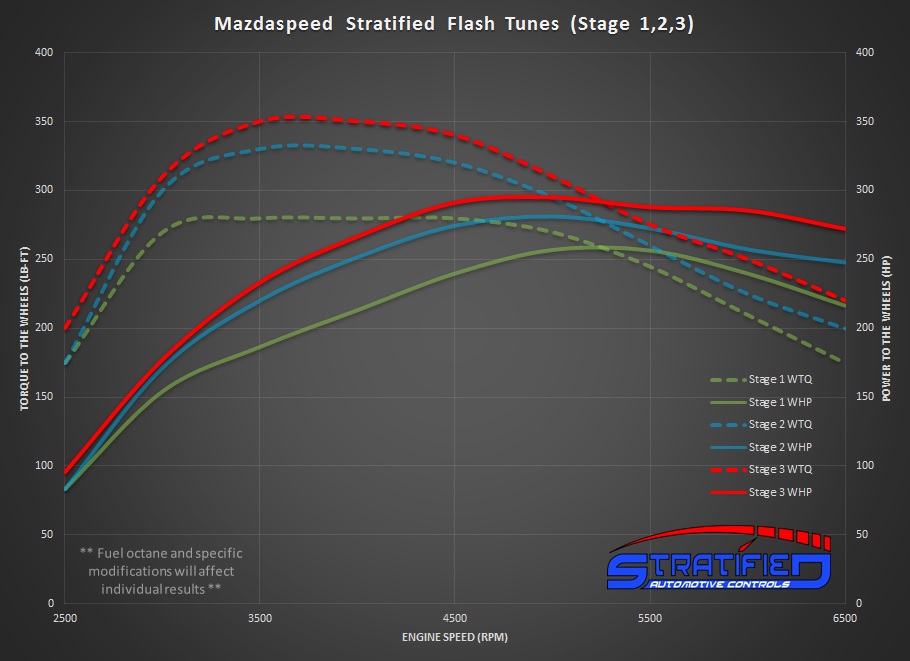 (Thread Starter) | Not Ranked : 0 score Happy to announce that we have V3.0 flash tunes now available on our site. I wanted to increase refinement of the tunes and move beyond Stage2. I also wanted to incorporate the latest features COBB released through the tuner software. So we now have a Stage3 tune to take further advantage of fully bolted cars. The E85 flash tune is updated as well. Here are the changes: - Stage 3 Flash Tunes allow for further power increase over Stage 2 for both Flash and E85 flash tunes if you have supporting modifications. - Additional refinements for bigger than stock intakes to maximize performance - Higher altitude tuning changes to minimize power loss due to elevation changes - Option to fix post shift stutter on cars that experience this (MazdaSpeed6) - Closed loop fueling extended to higher engine loads to ensure AFRs are always on target New customers - get your flash tunes here: Pump Gas: Stratified MazdaSpeed / Mazda MPS Flash Tune [Stratified Mazda Flash Tune] - $50.00USD : Stratified Automotive Controls E85: Stratified MazdaSpeed / Mazda MPS E85 Flash Tune [Stratified Mazda E85 Flash Tune] - $50.00USD : Stratified Automotive Controls If you already have a flash tune, the upgrade can be purchased here: MazdaSpeed/MPS Flash Tune Upgrade [MazdaSpeed/MPS FlashTune Upgrade] - $25.00USD : Stratified Automotive Controls ![]() ![]()