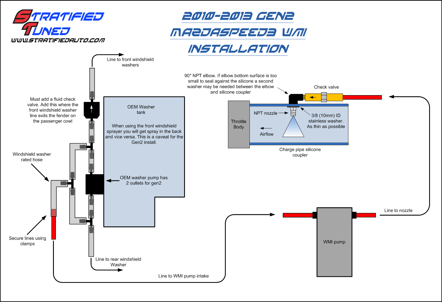 (Thread Starter) | Not Ranked : 0 score ************************************** UPDATED JAN 21 2013 **************************************Decided to update and revamp this post with some fairly thorough diagrams for both Gen1 and Gen2. I have also included a good method to mount the nozzle in the charge piping without tapping a hard pipe. I will leave the original post content and images below but all you need are the 2 diagrams and information below. I have also added this writeup to our Blog The octane and cooling benefits of installing a WMI kit on the MazdaSpeed and other vehicles is well documented. However one of the toughest parts of the installation is installing the fluid tank in a tight engine bay. The vehicles however come with a perfectly good and methanol safe tank for windshield washer fluid (washer fluid contains methanol). On top of this they have a low level light – a huge bonus. While tapping the stock tank is an option, there is another option for using this tank without tapping it – drawing through the OEM washer pump. The 2007-09 and 2010-13 vehicles have a different setup for this so we have created 2 diagrams attached below to show the two different setups. In both cases the windshield washers will continue working. However for the Gen2 (2010-13) cars the more complicated setup means that when activating the front washer, fluid will also be sent to the back and vice-versa. This can be a nuisance and if you don’t need the rear washer you can always just cap the line going to the rear washer. Now you no longer have to run lines inside the car or add another tank and can enjoy the benefits of WMI if these were holding you back! ![]() ![]() ************************************************** ***** Well, as I found out, we get really shitty gas here on the west coast. 94 octane knocks like a bitch in 4th gear and up and I got fed up with it. So I decided install meth/water injection to keep the motor clean, knock at bay, and BATs happy with a top mount. I wanted to keep it all in the engine bay and modify as little as possible. No need to add a tank in the trunk or run lines from a pump in the tank. As you will see in the pictures below, the install included the following: 1. Tapped stock cold pipe and a Devil's own D05 nozzle, tight 90 degree turn, and check valve. The DO 90 degree turn makes all the difference here because you don't want to be hitting the hood with a tall nozzle such as the one from snow performance. 2. The pump was mounted where the horn is. A longer bolt is used to hold the pump in place with the horn behind it. Twin zap straps fit perfectly through the frame rail openings and the seemingly useless little bracket behind the driver side bumper offers another support. Make sure you pad your pump properly if it touches anything as it will vibrate and make noise. 3. The meth source. I used the stock windshield reservoir. At first I was going to tap it, but I quickly realized that water comes out if you unplug the stock washer pump. So I used a T to draw meth right through the pump. Everything works great and no tapping needed! I ran the hose in front of the bumper and covered it in wire loom to keep the color black. 4. The electronics. I got a sweet deal on a used Snow performance stage 2 kit. So I had a controller with a built in map sensor. I mounted it on the driver strut tower ... might move this but for now it does the trick. Power comes from an accessory fuse where an add-a-fuse was added. Make sure the source turns on with key on and off when key is off. 5. Finally for the boost source used a T from the BOV. Make sure all connections are sound, no chance for electrical shorts, and use zap straps to brace loose hoses and wires. After fiddling with the onset and full flow settings, I must say I love WI. Knock is down by at least 2 degrees and BATs fall to even below ambient! Heatsoak is much less of an issue and power is always there. Now I need a fuel pump as I am always running in "cold weather" Last edited by Lex; 01-21-2013 at 01:16 PM. |