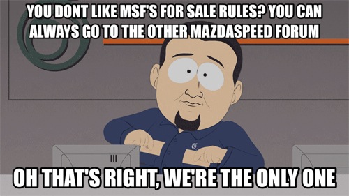 __________________ 2011 Mazdaspeed 3- AccessPORT V2, Autotech HPFP Internals, 3 Bar MAP Sensor, 3" Catless Downpipe, CPE Stage 2 RMM, CPE TMM, Custom Saikou Michi OCC, CXR FMIC, Devils Own DVC-30, Forge V2 BPV, 3.5" HTP Intake, JBR TIG's, MME Shifter Bushings, NGK LTR7IX-11's, PNP Intake, SPEEDPERF6MANC3 Valve Cover Breather 2004 Mazdaspeed Miata #3142- Stock, but not for long. ![]() Equal rights for all, special privileges for none. ~ Thomas Jefferson |